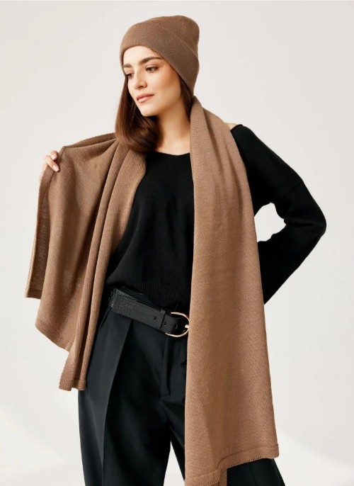 Miękki i elegancki szal z wełny merynosów w kolorze carmel to klasyczny dodatek na chłodne dni. Wykonany w 100% z wełny merino, jest ciepły, lekki i przyjemny w dotyku. Doskonały szal damski do płaszcza lub codziennej stylizacji – stylowy, naturalny i ponadczasowy.