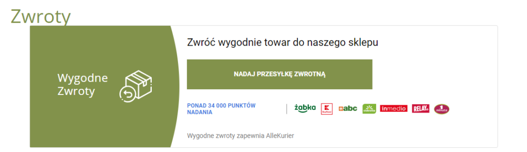 A jeśli nie masz możliwości nadania zwrotu samodzielnie – skorzystaj z opcji wygodne zwroty. Kliknij w banner poniżej, opłać zwrot wygodną metodą płatności i wybierz punkt nadania zwrotu. Pamiętaj aby do paczki również dołączyć formularz zwrotu, który jest dołączany do każdego zamówienia lub dostępny do pobrania powyżej jeśli gdzieś Ci się zagubił. Postępuj zgodnie z instrukcją z formularza, zanieś zwrot do wybranego przez Ciebie punktu i gotowe 🙂